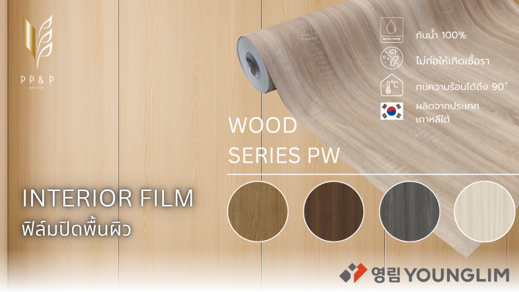 ฟิล์มตกแต่ง ลายไม้ หน้ากว้าง 1.22 m. ยาว 1 m. หนา 0.3 mm. วัสดุปิดผิว กันน้ำ กันไฟ ไม่เป็นเชื่อรา ทำความสะอาดง่าย สามารถติดได้บนผิวเรียบทุกประเภท