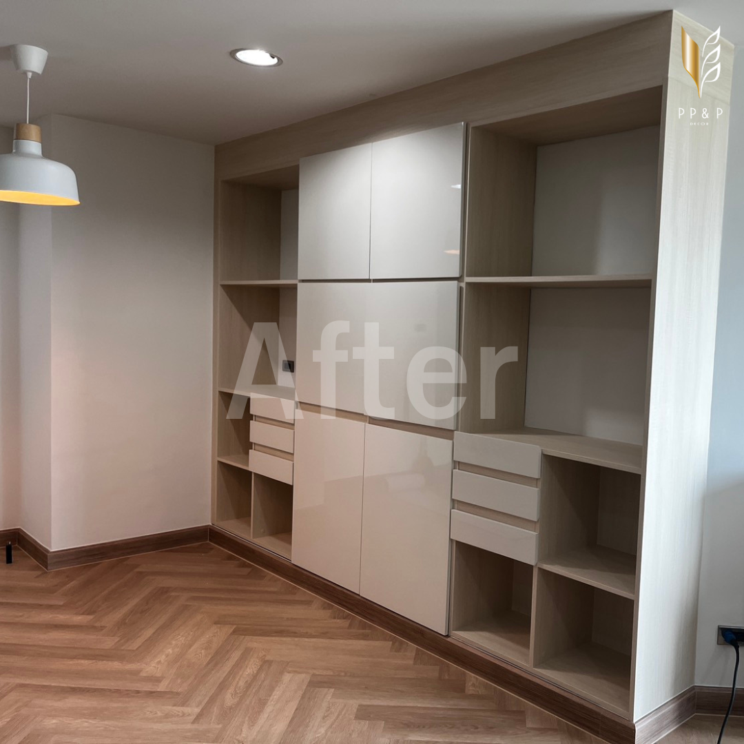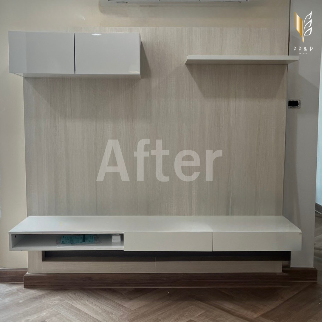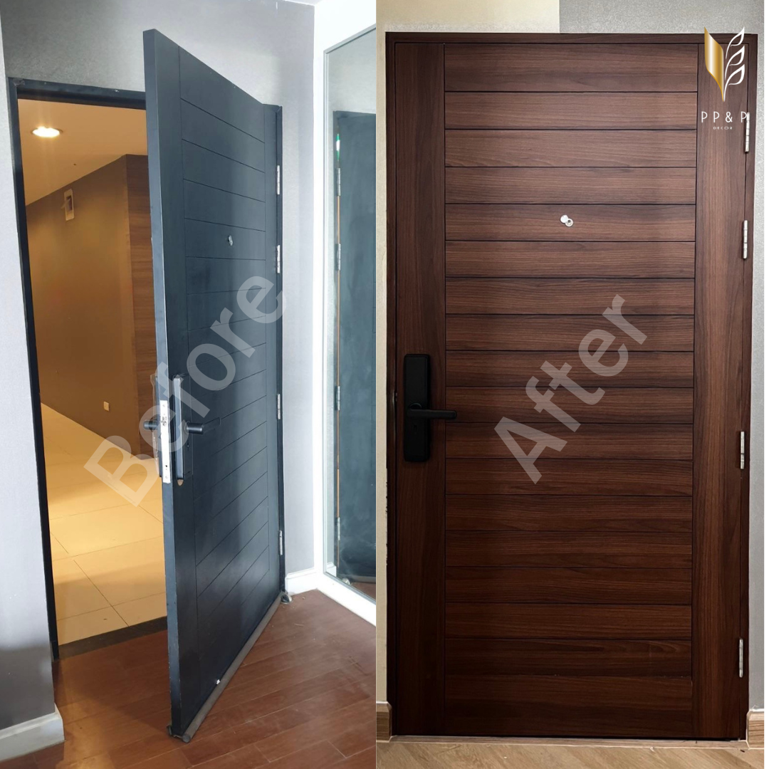 ลูกค้าเลือกใช้ฟิล์มลายไม้โทนอ่อน ให้ความรู้สึกอบอุ่น เรียบหรู และดูสว่างขึ้นอย่างเห็นได้ชัด
