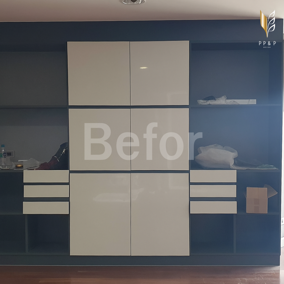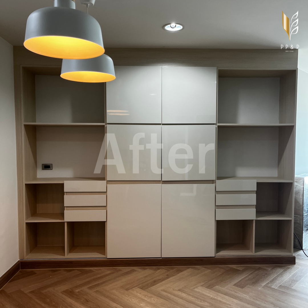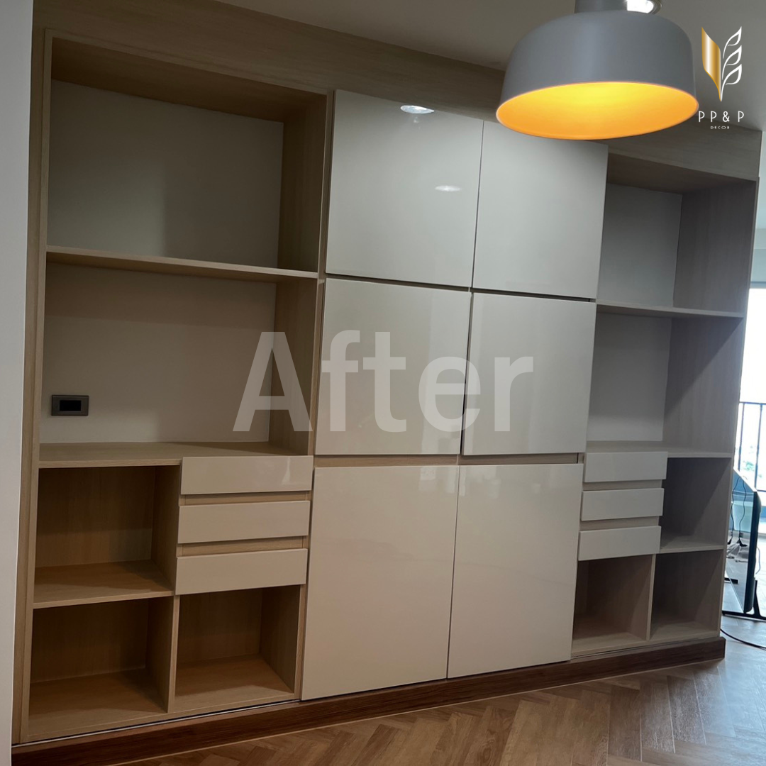 ลูกค้าเลือกใช้ฟิล์มลายไม้โทนอ่อน ให้ความรู้สึกอบอุ่น เรียบหรู และดูสว่างขึ้นอย่างเห็นได้ชัด