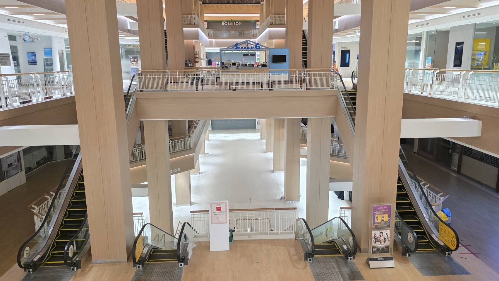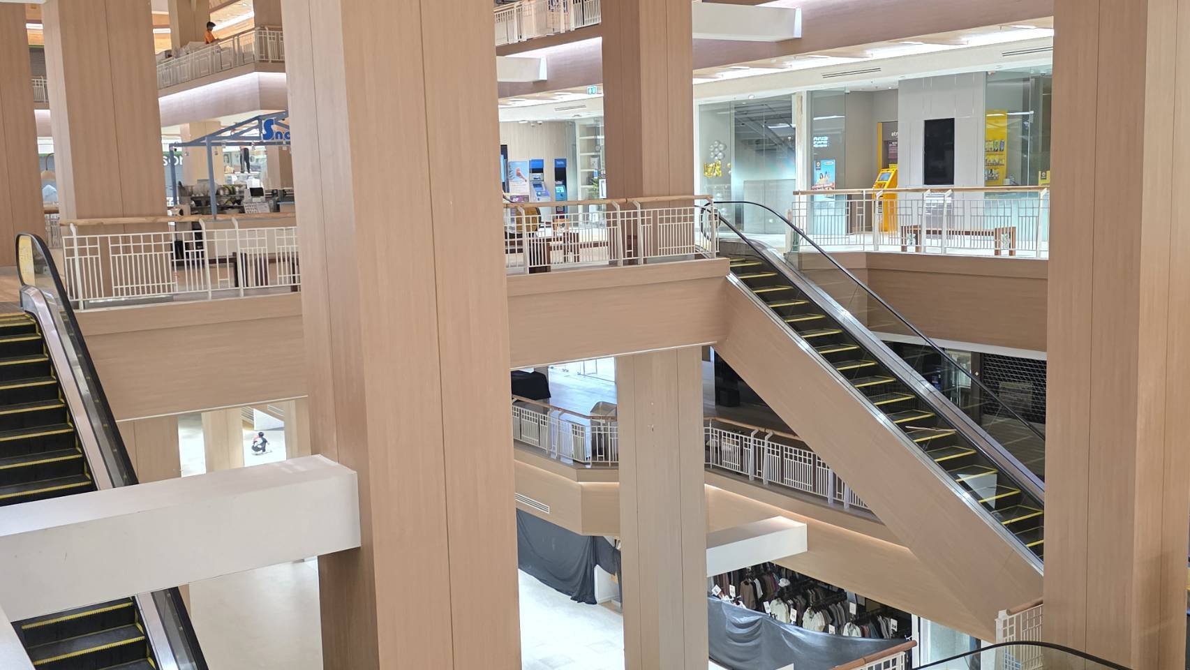 ผลงานการติดตั้งเสาสูง,บันไดเลื่อน,ฝ้าขอบวอย ด้วยวัสดุ "อินทีเรียฟิล์ม" ลายไม้